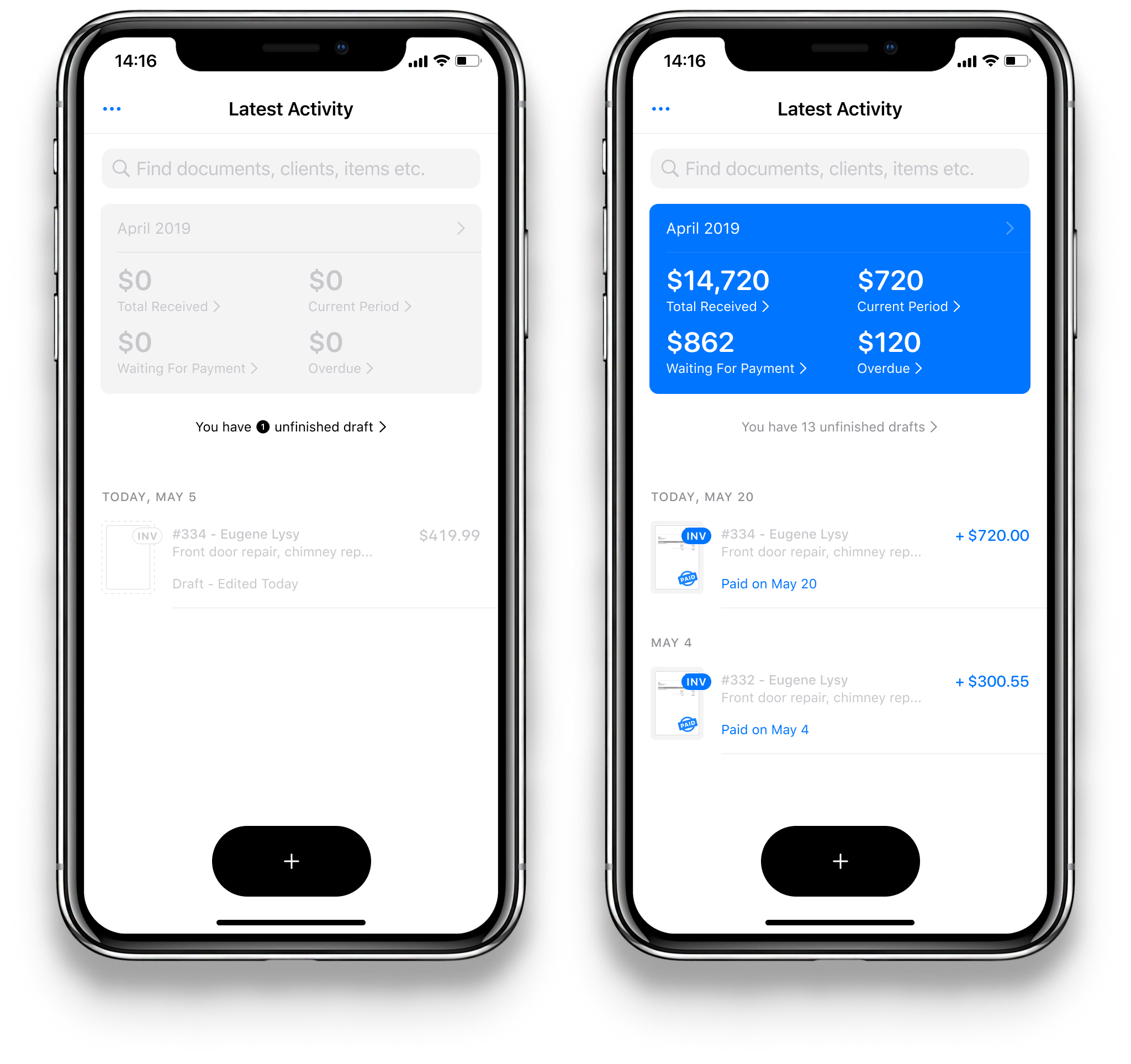 When user hasnât sent any invoices yet, the app appears greyish. This helps to bring up the main button and keep the screen less noisy. After at least one invoice has been sent to a client, the appâs main screen starts to appear in colour.