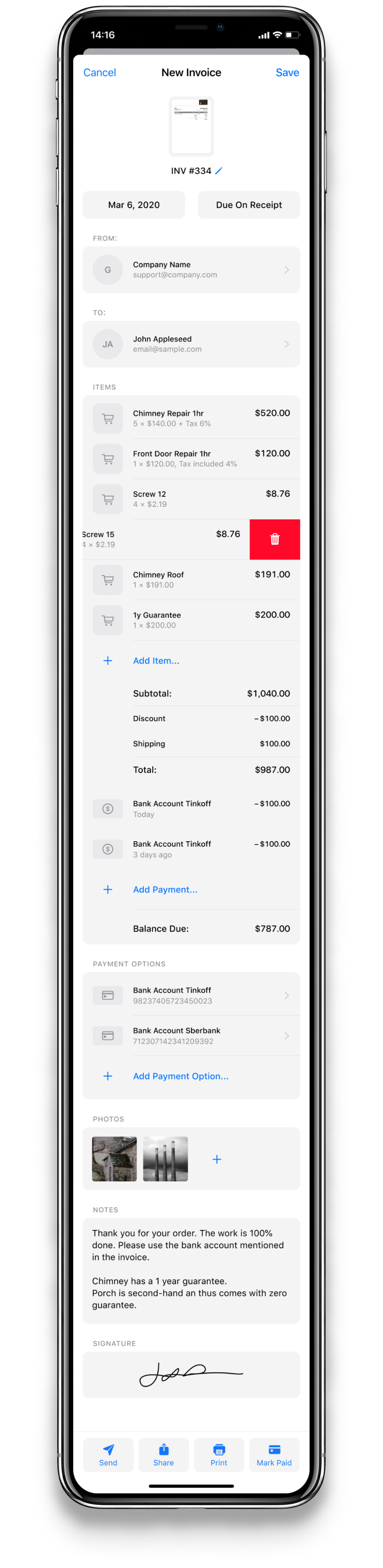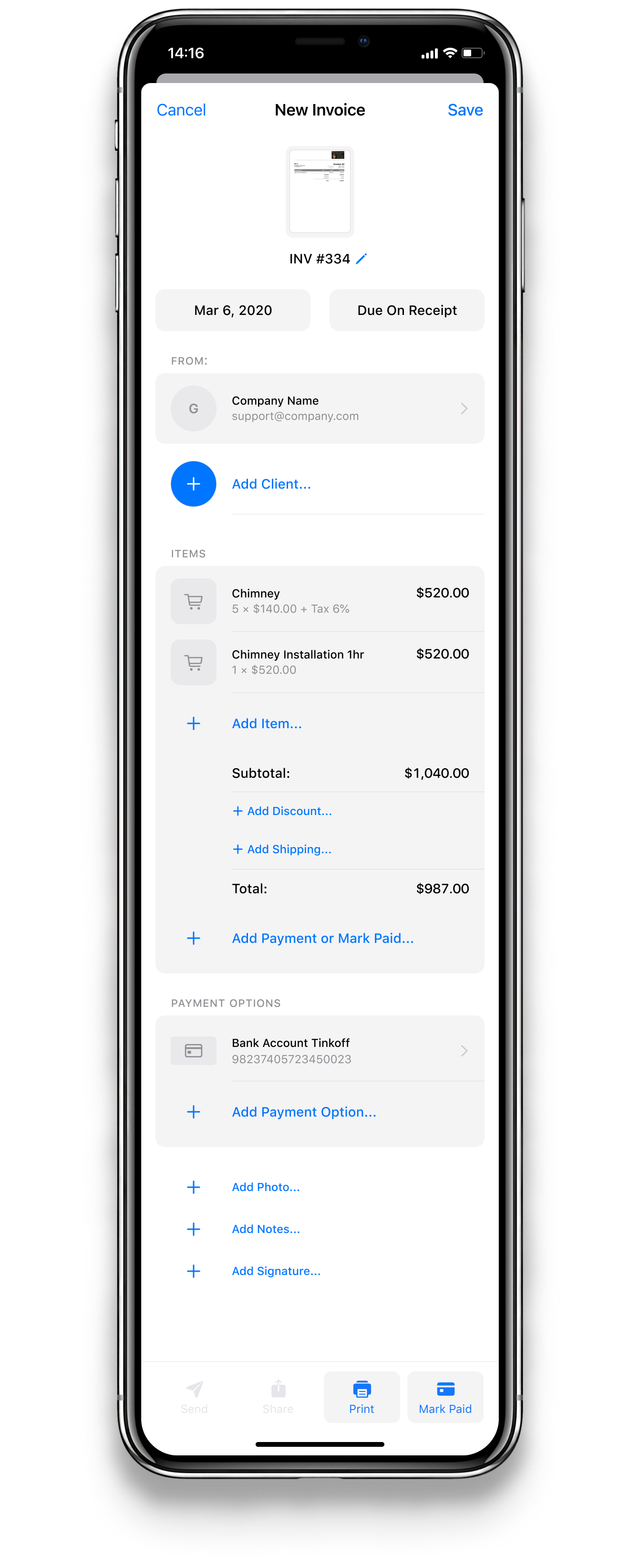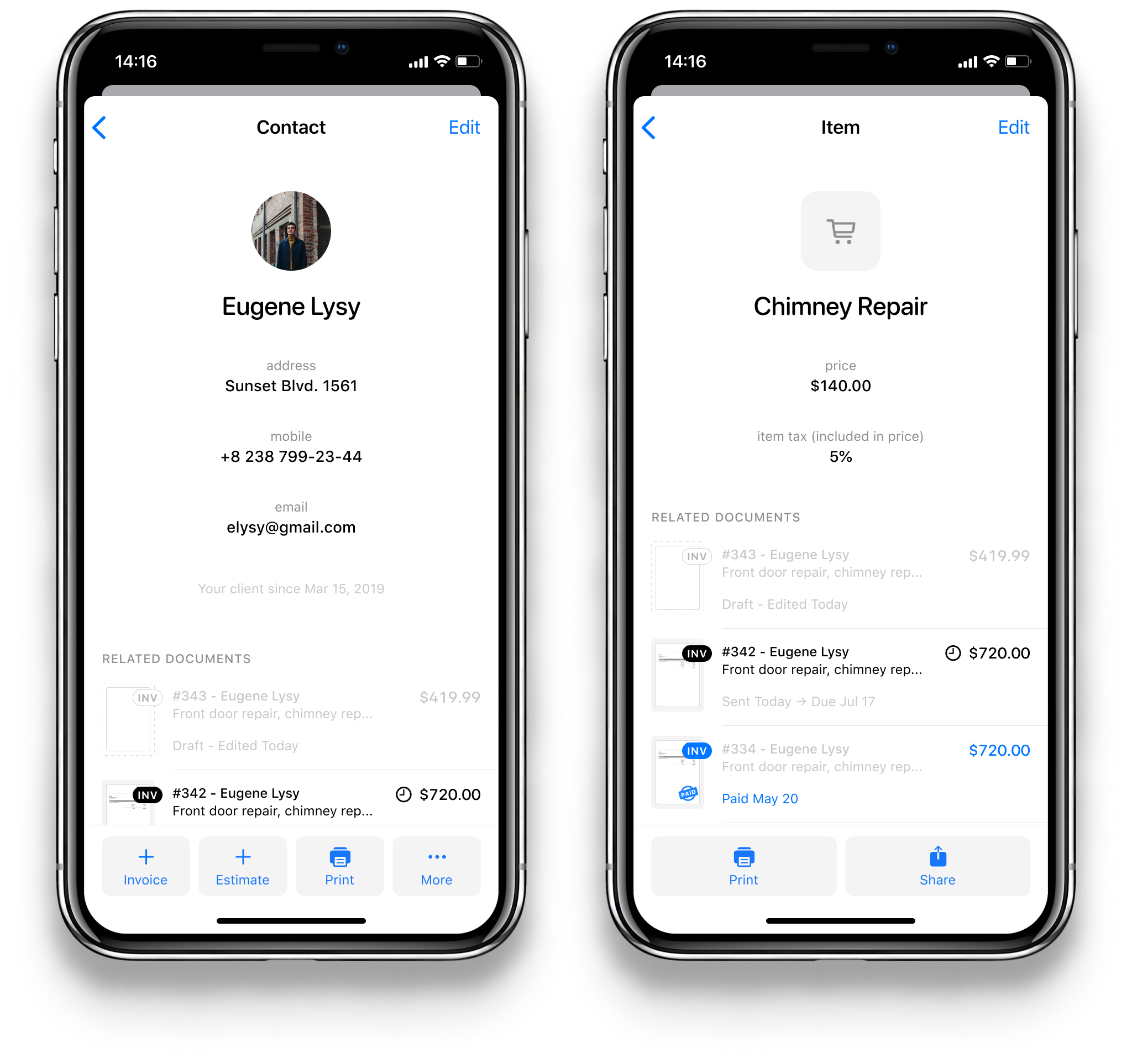 The white sheet works as a preview and allows to craft a perfect invoice with no fuss. As simple as it looks, the app has many minor nuances that make working with it smooth and pleasant.