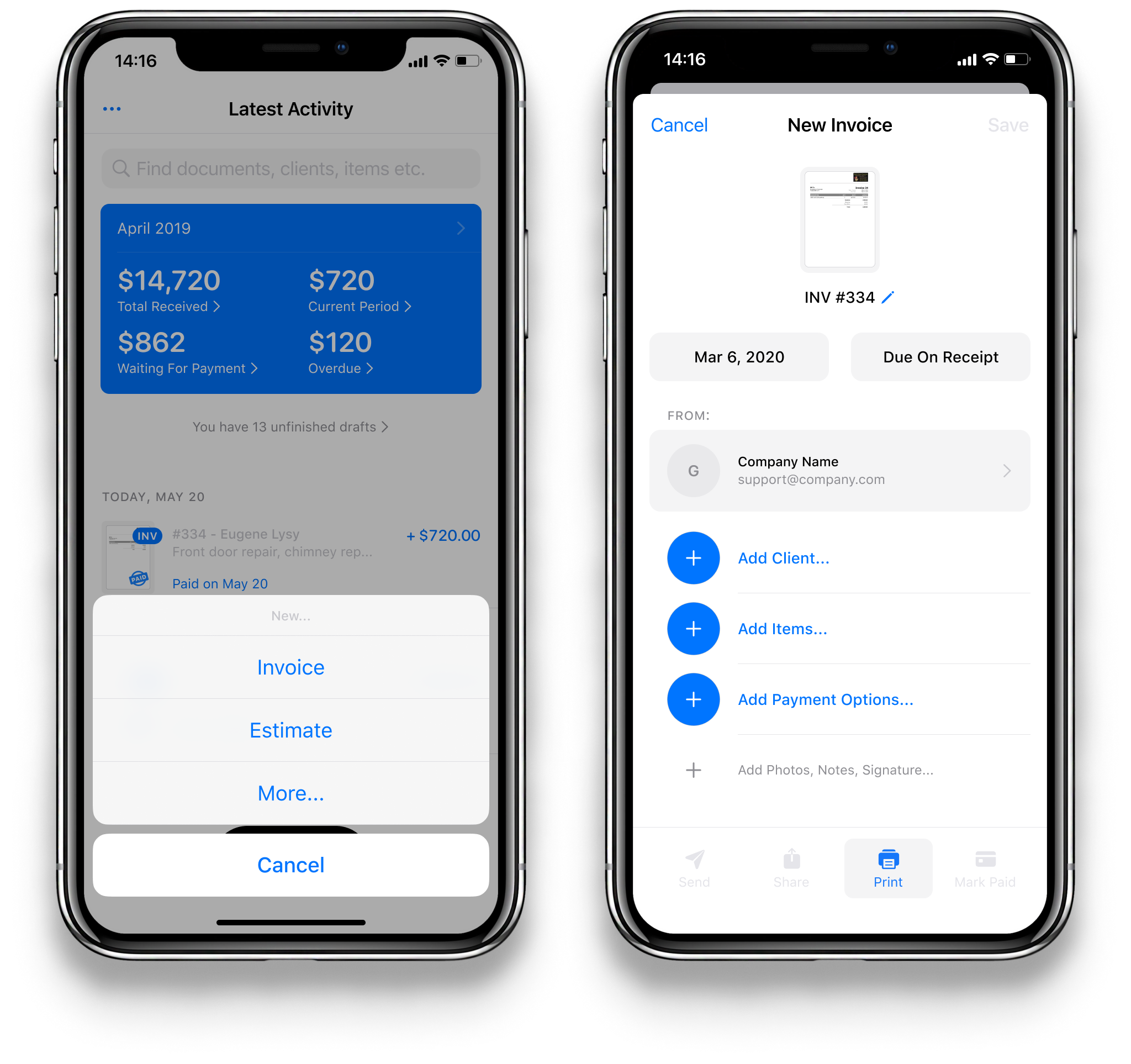 The âNew Invoiceâ screen immediately suggests the user to add the most crusial information of an invoiceâthe client, the items, and the options to pay.