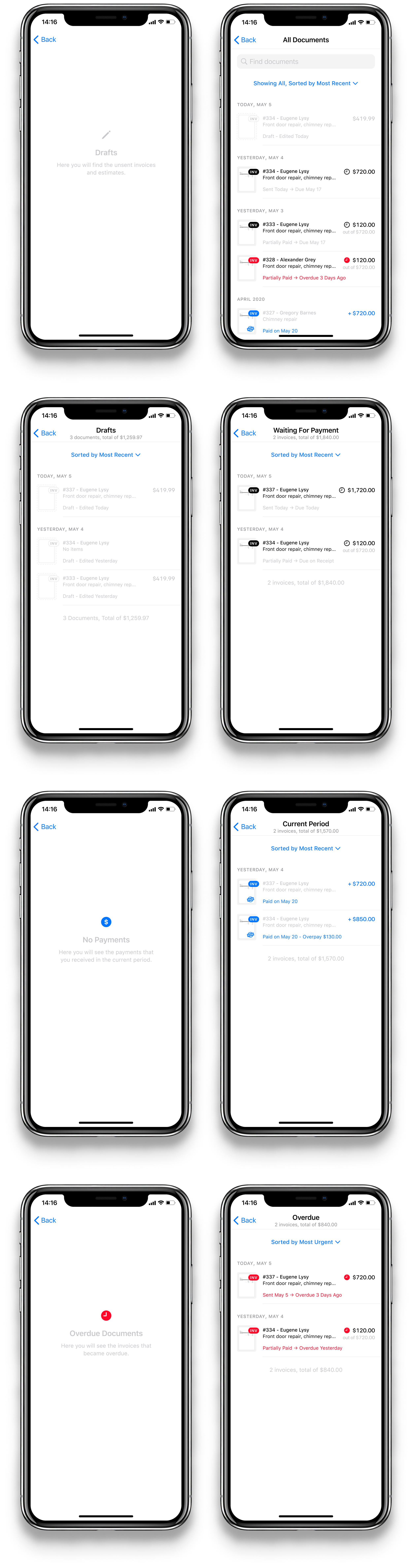 The app provides a handful of angles to view one's data. All the clients, items, and documents are organized: